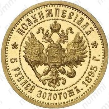 В правой лапе орёл держит скипетр, а в левой державу. Государственный Герб окружён витой точечной окружностью. За окружностью, вдоль канта, надпись: сверху, над орлом — «ПОЛУИМПЕРIАЛЪ», снизу, под орлом — «5 РУБЛЕЙ ЗОЛОТОМЪ. 1895 Г.». Надписи отделены друг от друга цветочными розетками. Буртик украшен зубцами.